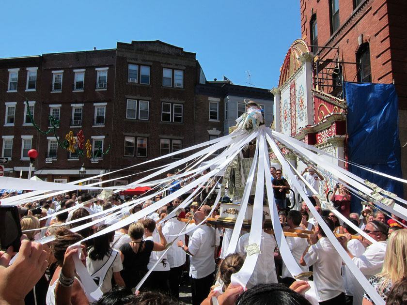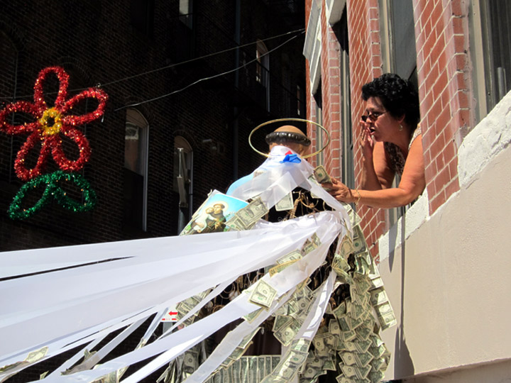 I’m also fascinated by the procession of St. Anthony through the North End to receive donations from the faithful. Religious processions are very common in Europe but not at all known in America thanks to our Puritan ancestors. While the procession in the North End is quite impressive to watch, it’s not quite what I’ve seen in Italy. I can’t help but think that people participate because they grew up doing this. Every year the organizers must think back to what they remember and decide if any changes will be too much deviation from the past. Event marshals crowd about with their official ribbons of distinction, very much attuned to the social aspect of the festival, but also concerned with the continuity of the tradition. Children and grandma’s cling excitedly to ribbons of cash for the Saint statue because it’s what they do every year. The propagation of this hybrid Italian-American culture is what makes the festival so fun and touching.