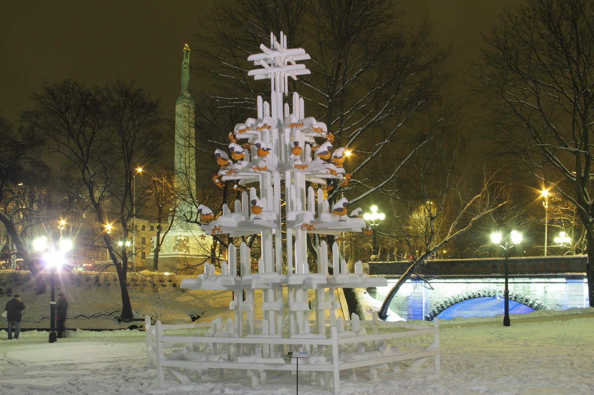 The Christmas Tree Trail (official website) is a fresh interpretation of a very old tradition.  Residents of Latvia have been decorating Christmas Trees for over 500 years.  In 2010, Riga organized a exhibit of avant garde art trees created by local artists and students from the Latvia Academy of Arts.  The event was so popular that it has now become an annual event!  Some of the most popular trees are brought back from year to year and shown alongside new pieces.  For example, “Who Brought the Christmas Tree” by Iveta Heinacka and Laura Bistrakova (shown above) is back for its second year.  For 2013, there are 65 trees in total on display!