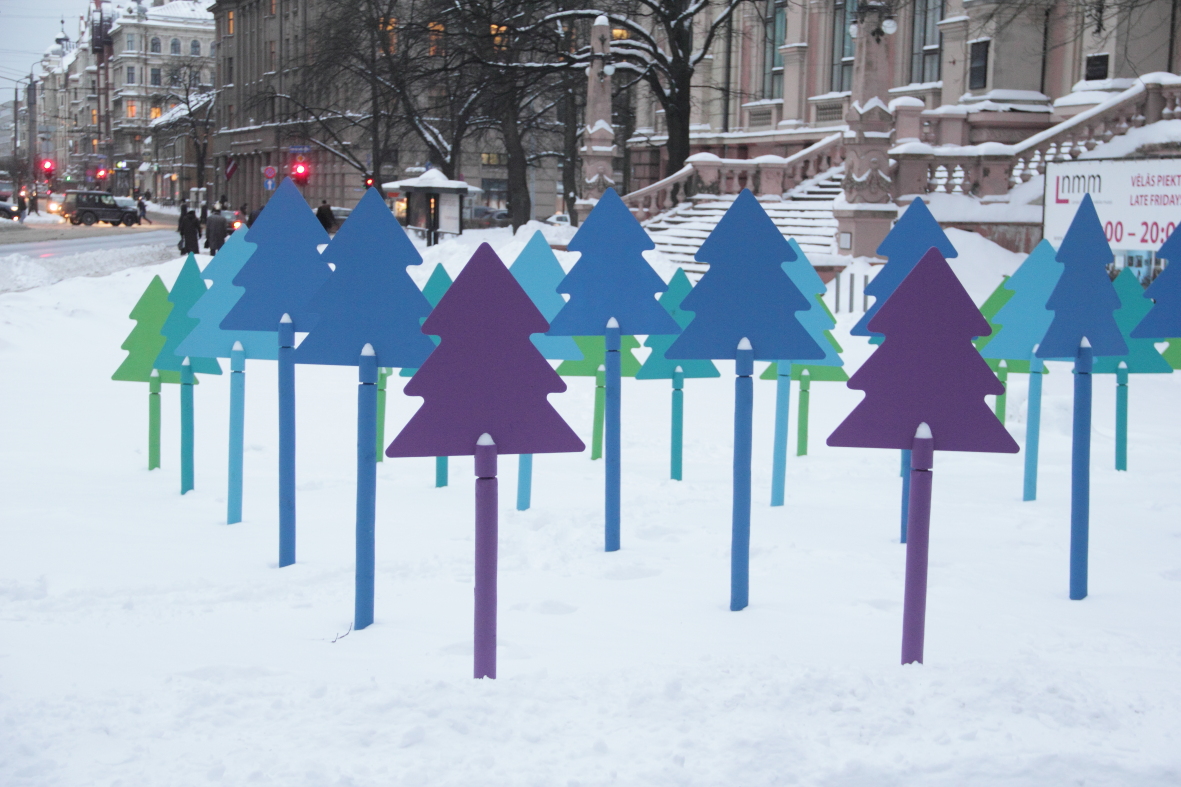 One of my favorite parts of the holiday season is the festive decorations.  From wreaths to bows, snowflakes to candy canes, I love how city streets, shop windows and public buildings are transformed.  Riga, the capitol of Latvia, has taken this one step further and is sponsoring a public art exhibition called the Christmas Tree Trail.  Artists and students have constructed modern interpretations of  the classic Christmas tree.  These fantastic sculptures are on display throughout the city from December 6 – January 12.  Let’s take a look at some of my favorites!