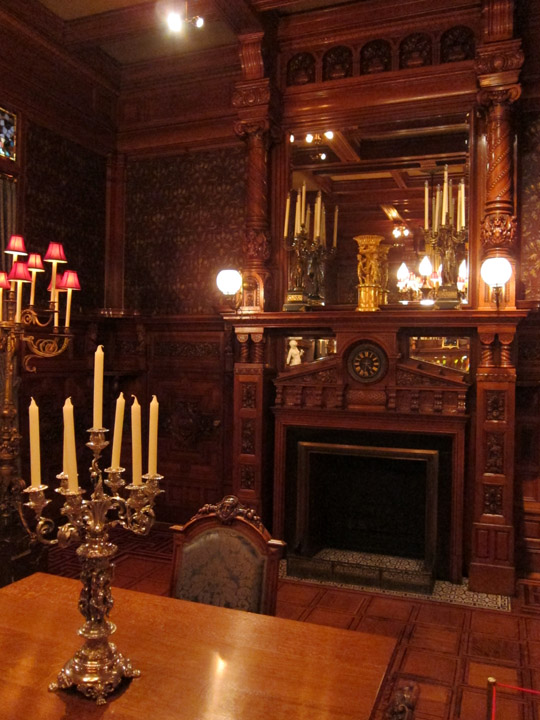 The dining room has extensive carved wood paneling in the Victorian style. Likewise, the table and chairs are thick, weighty, and highly ornamented pieces.