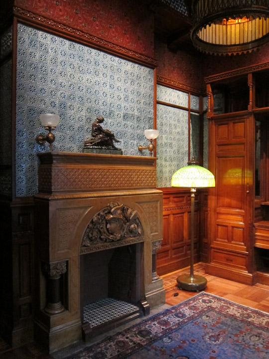 The Driehaus museum seeks to present the range of decorative styles that one would have seen in a fine Guilded Age mansion and so several of the upstairs rooms feature very American Art & Crafts furniture. The fireplace below is an exquisite example with inlaid tiles both around the fireplace and in the cabinetry. While using wood to construct the fireplace was already a stylistic departure from previous design concepts, the construction, artistic details, and symmetry are beautiful.
