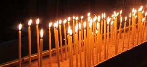 Candle holder just after the Chapel of Golgotha within the Holy Sepulchre. These thin beeswax candles are an important part of Orthodox worship.