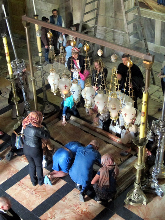 Pilgrims touch and place objects on the Stone of Anointing believed to be where Jesus’ body was laid after the descent from the cross.