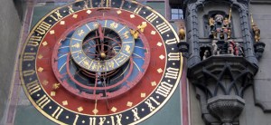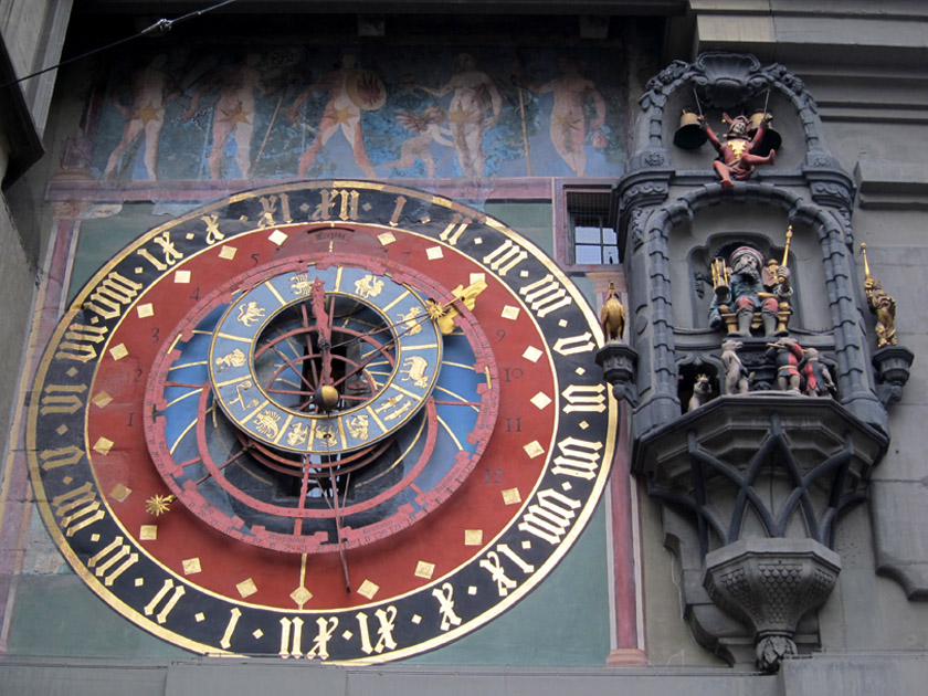 Bern’s Clock Tower (or Zytglogge) is fitted with the most advanced astronomical technology of 1405. It shows the hour, day of the week, day of the year, phase of the moon, zodiac, sunrise and sunset. To the right, an animatronic jester rings out the time on the hour while bears march below until finally a cock crows and Father Time flips his hour glass.