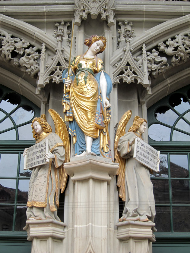 The public fountains of Bern are elaborately decorated and each include a human figure at the center. These eleven fountains date to the 16th century and range from allegorical figures like Justice to characters like Samson and finally to fantastic creatures like a Warrior Bear.