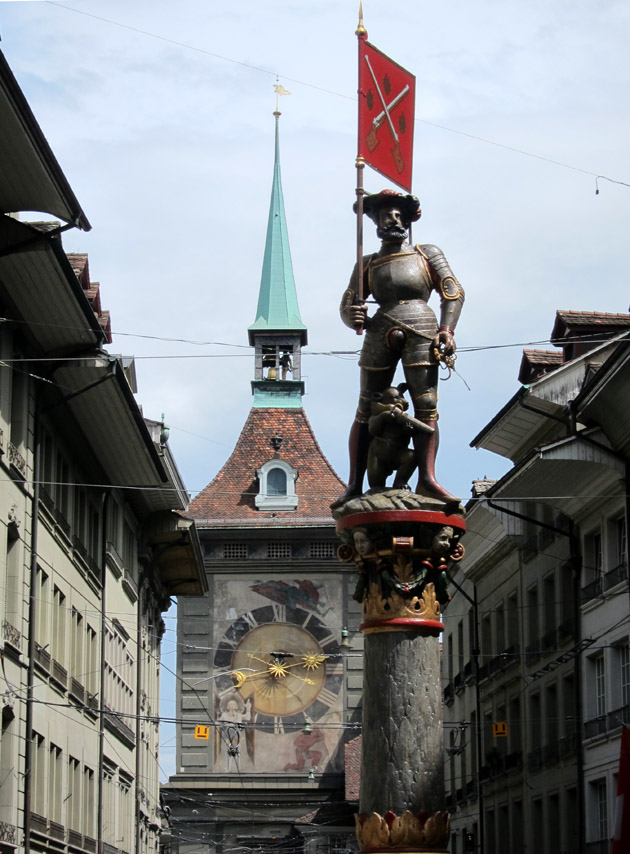 The Marksman Fountain (or Schützenbrunnen) and in the background, the opposite face of the Zytglogge.