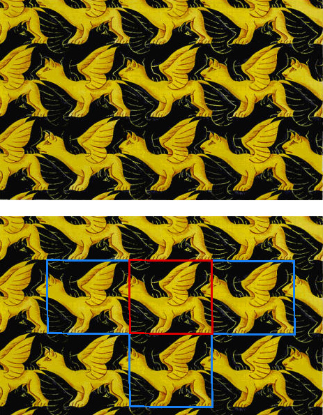 The unit cell in red can be cut and pasted, or translated, to yield the repeating winged lion pattern in the blue boxes. (Photo: mcescher.com, symmetry gallery)